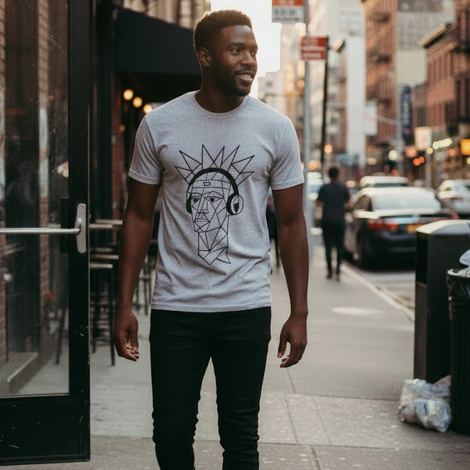 The Cubist Man Wearing Headphones Short Sleeve Staple T-Shirt brings modern city life into cubist form. Featuring a line drawing of a man with spiky hair and a headband, headphones firmly in place, the design captures a quiet, familiar moment: zoning out on an NYC bus, letting music fill the space until it’s time to get off. It’s everyday life reimagined as artwear — abstract, geometric, and deeply human.