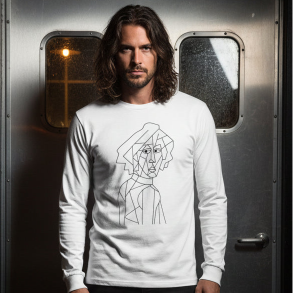 The Cubist Psychedelic Legend Long Sleeve Staple T-Shirt reimagines the icons of the 1960s through the sharp lens of cubism. Featuring a line drawing of a long-haired psychedelic rock star in a high-collared, era-defining shirt, this design blends vintage counterculture with modern abstract form. It’s equal parts tribute and reinvention — a nod to the days of love, protest, and music that shook the world, filtered through Mikey Yaw’s artwear vision.