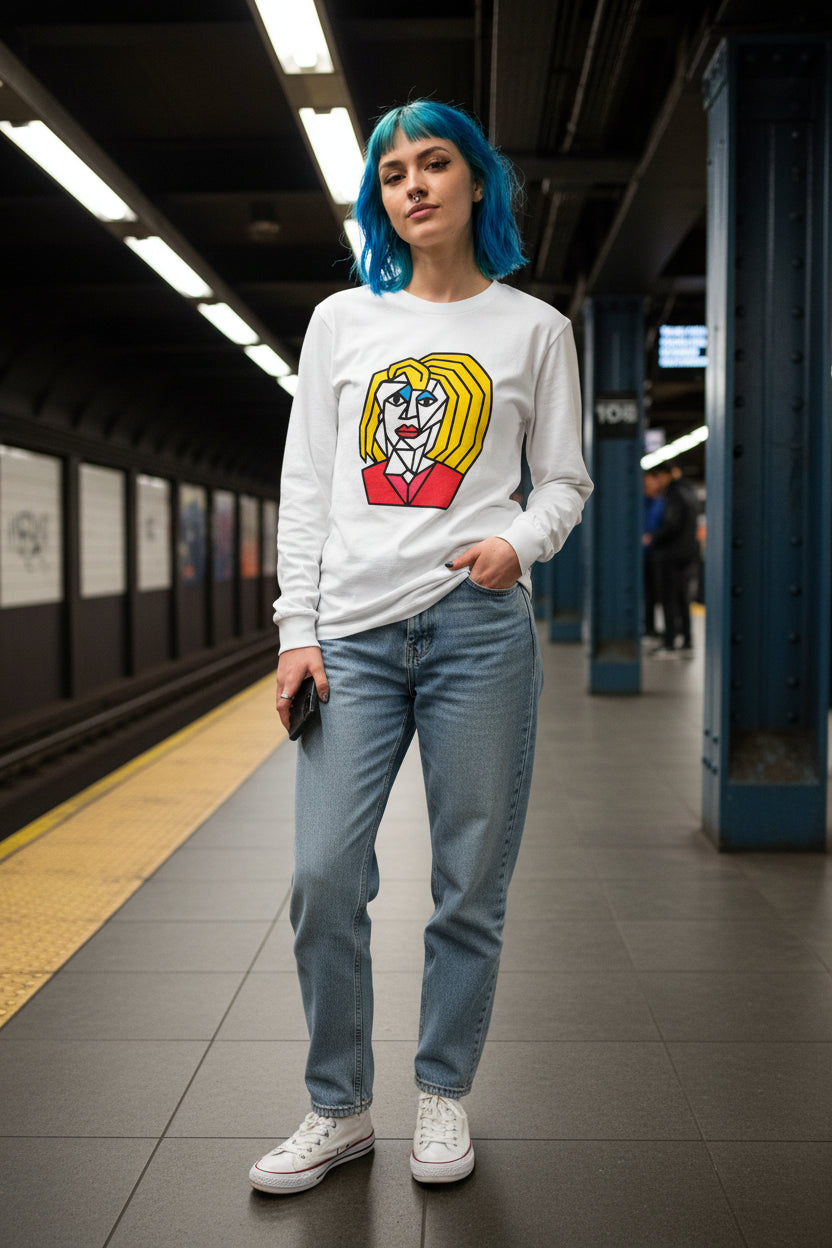 The Cubist Totally 80’s Blonde Woman Long Sleeve Staple T-Shirt is an ode to a decade of immense creation, unforgettable style, and unapologetically big hair — a time when art, music, and individuality collided in technicolor brilliance.