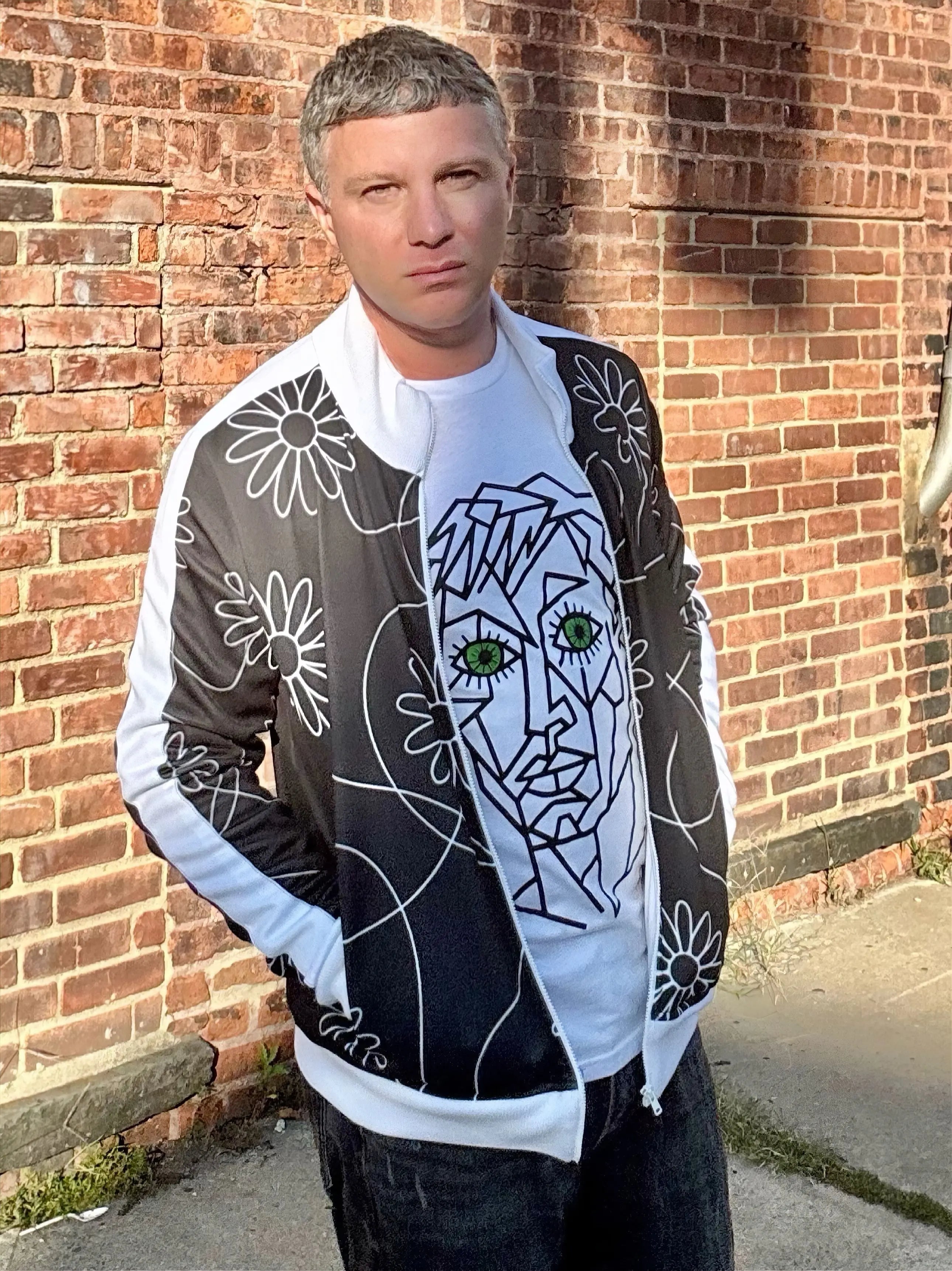The Flower Pattern Track Jacket is where structure meets flow, art meets motion. White line drawings of flowers weave across the jacket in an abstract, interconnected pattern.  Whether you’re warming up, cooling down, or just moving through the city, this jacket brings quiet strength and artful edge to your look.