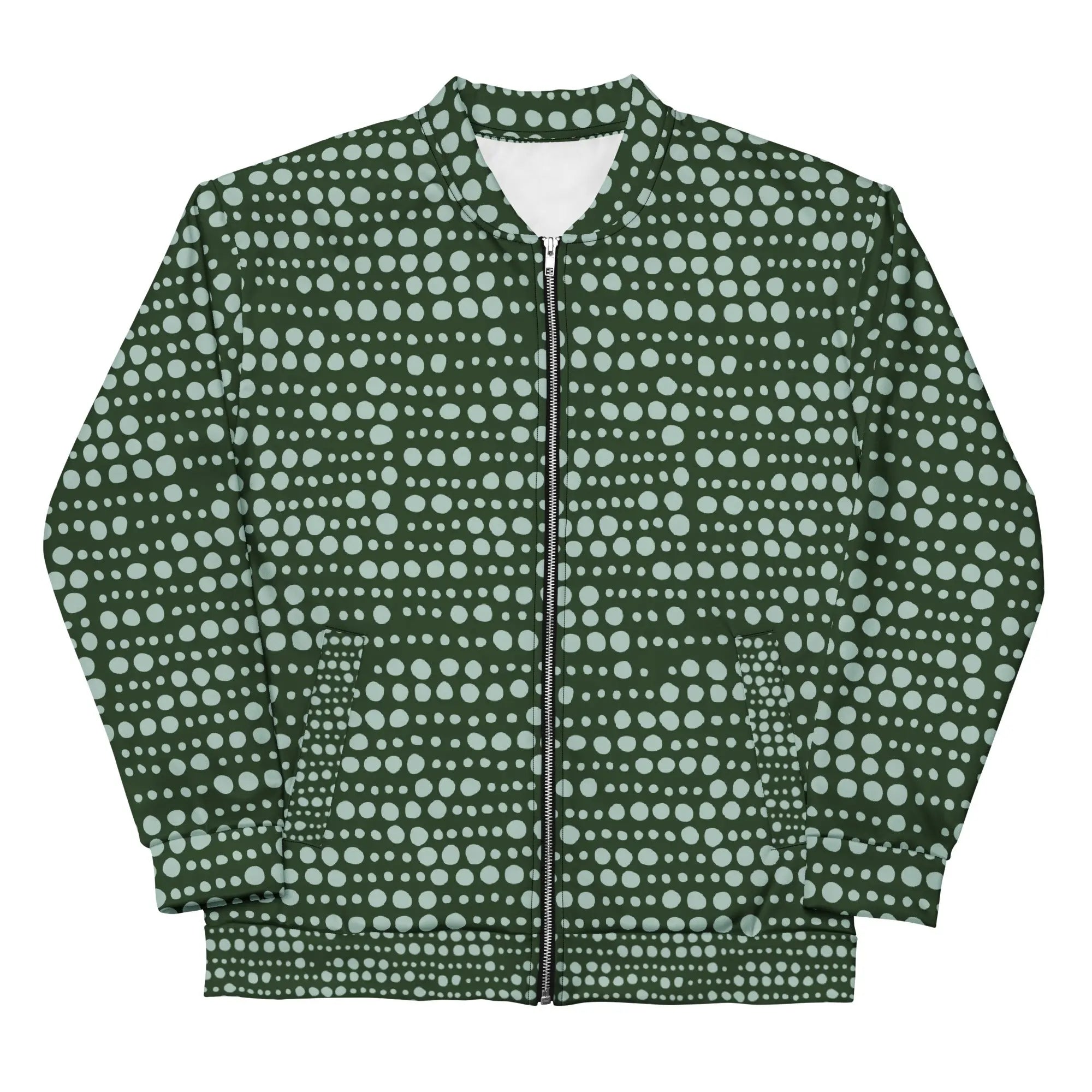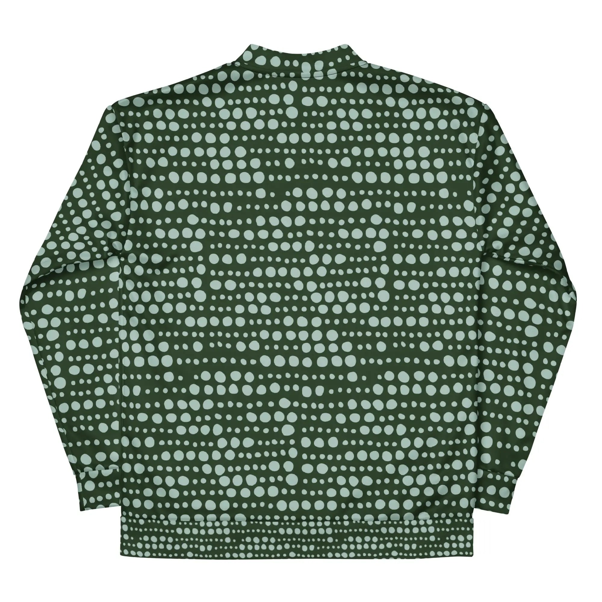 The Green Abstract Unisex Bomber Jacket blends calm tones with a bold, modern edge. White dots of varying shapes scatter across a rich olive green canvas, creating a design that feels both organic and intentional — like constellations drawn across the night sky or brushstrokes captured mid-motion. It’s understated but far from boring, the perfect mix of artful abstraction and everyday versatility. Whether you’re layering it over streetwear staples or dressing it up with clean lines, this bomber has range, character, and effortless style.
