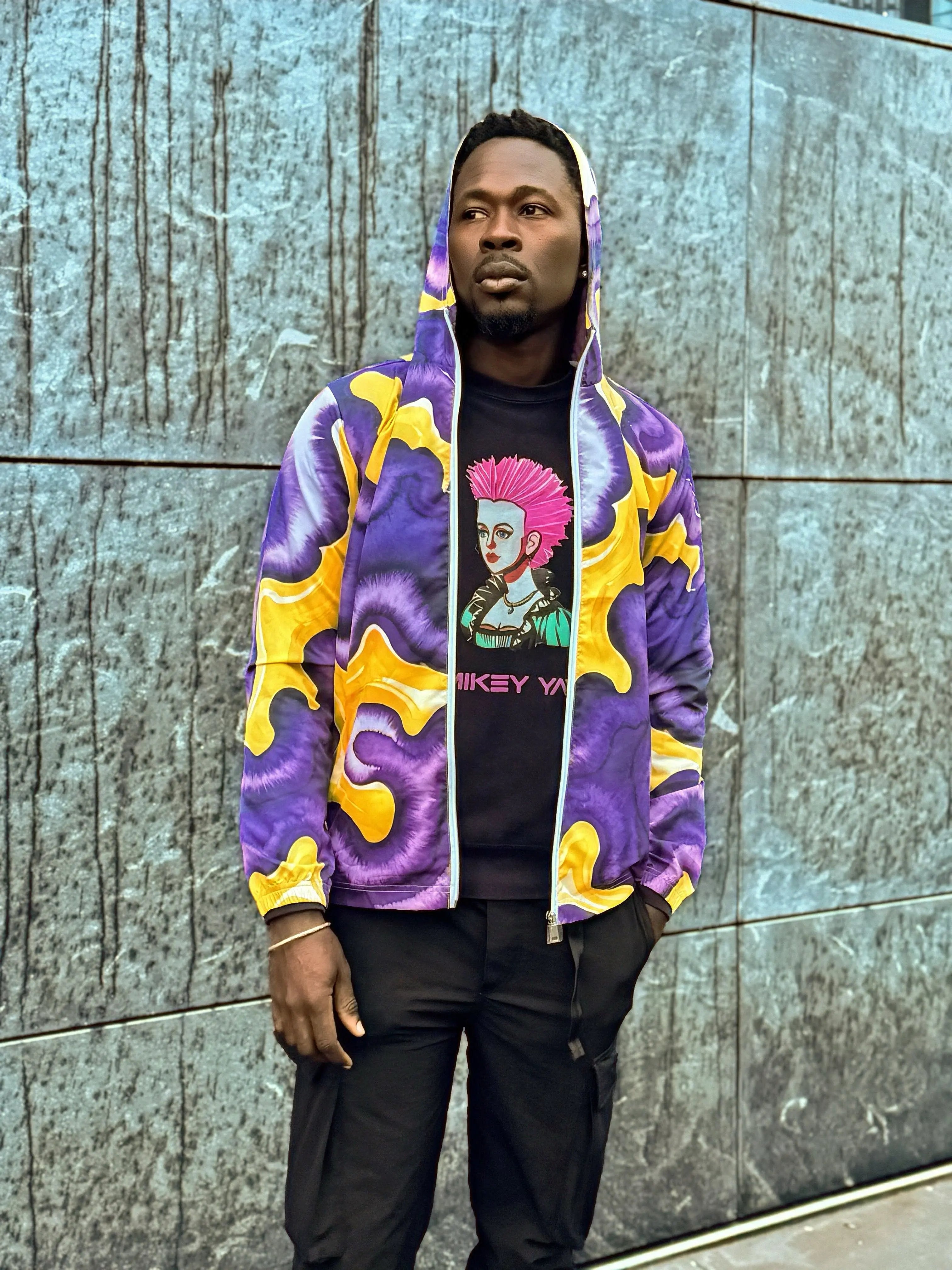 Welcome to the glow-up. The Ultraviolet Afterglow Windbreaker takes you straight to that magical hour—right after the sun dips, when purples melt into gold and the sky looks like it’s been painted. With a watercolor swirl of violets, lavenders, and luminous yellows, this jacket doesn’t just catch the light—it radiates it. Lightweight, breathable, and water-resistant, it’s made for everything from rooftop hangs to rainy day struts. This is streetwear with a soft touch and a bold spirit.