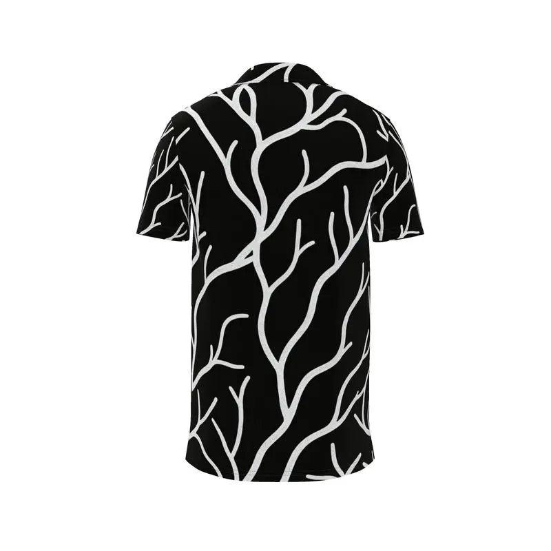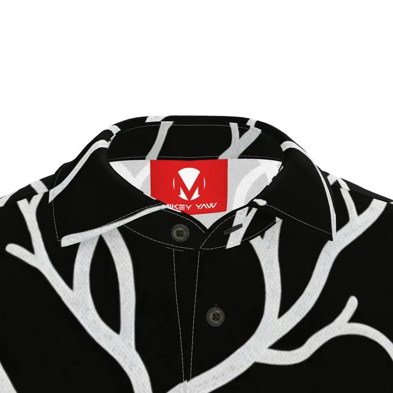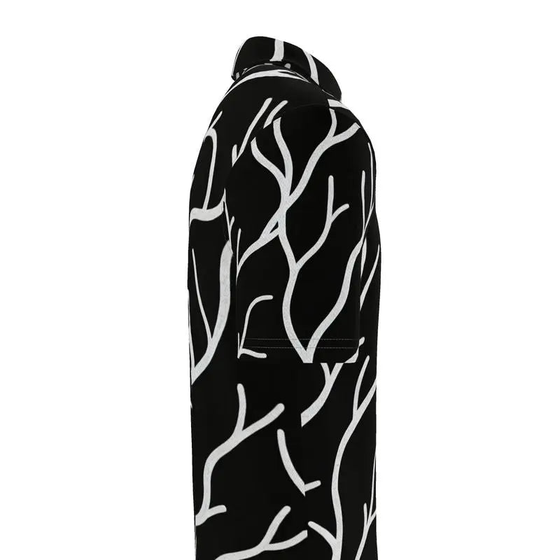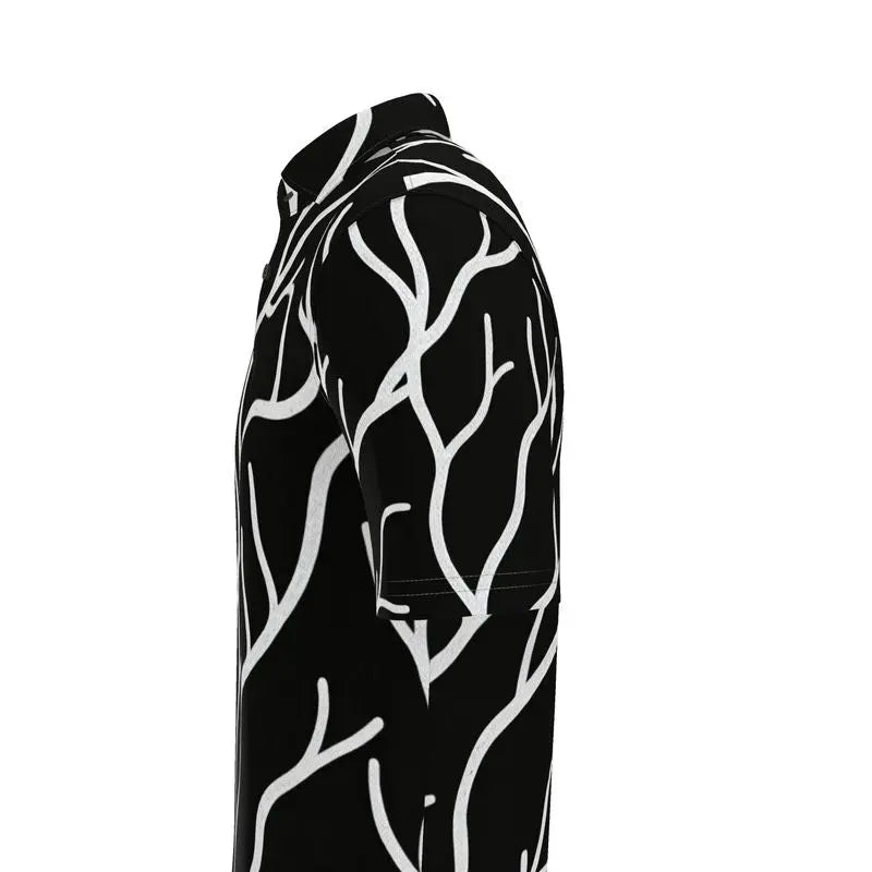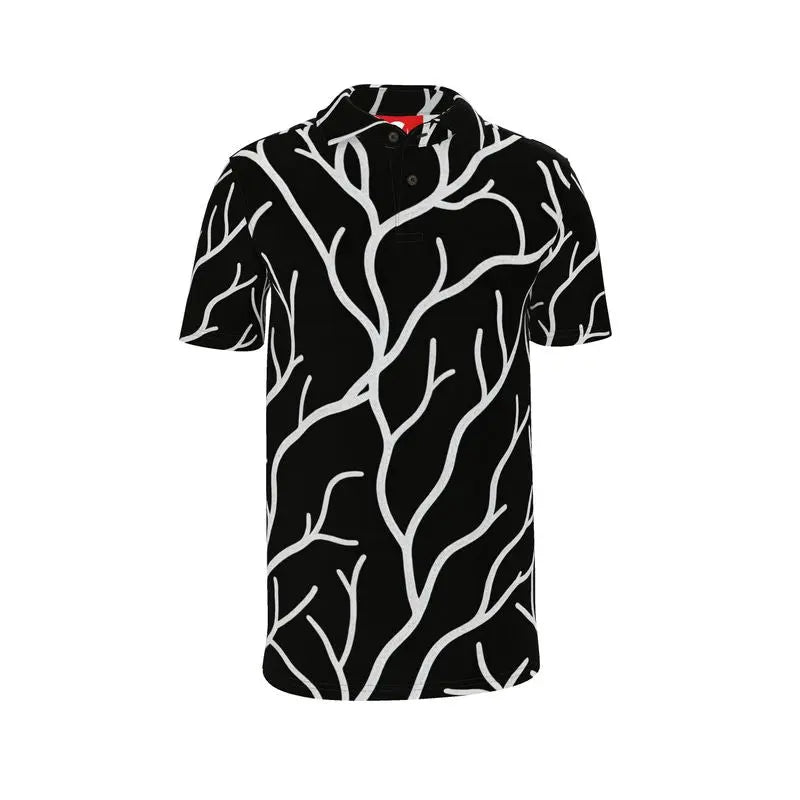 The Midnight Canopy Premium Polo Shirt transforms the elegant structure of branching forms into bold wearable art. White organic lines stretch across a deep black background, resembling the silhouette of tree branches spreading across a midnight sky. The Midnight Canopy Premium Polo Shirt blends nature’s quiet beauty with modern graphic design, creating a polo that feels refined, mysterious, and effortlessly stylish.