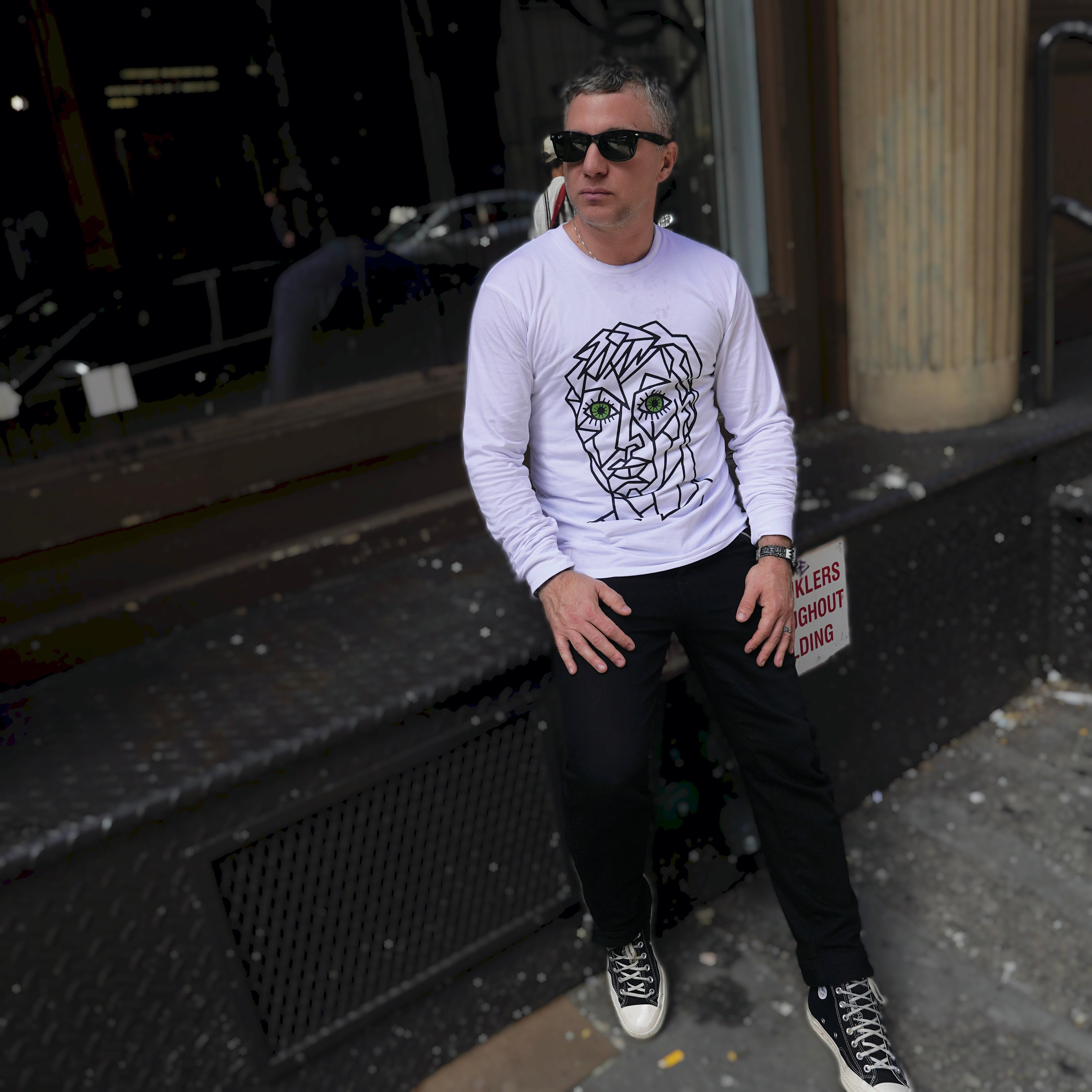 The Cubist Green Eyed Man Long Sleeve Staple T-Shirt is a cubist-inspired self-portrait illustration of Mikey — stripped down to bold line art with just enough detail to capture the essence. The standout feature? Striking green eyes that draw you in, giving the piece a surreal yet intimate presence.