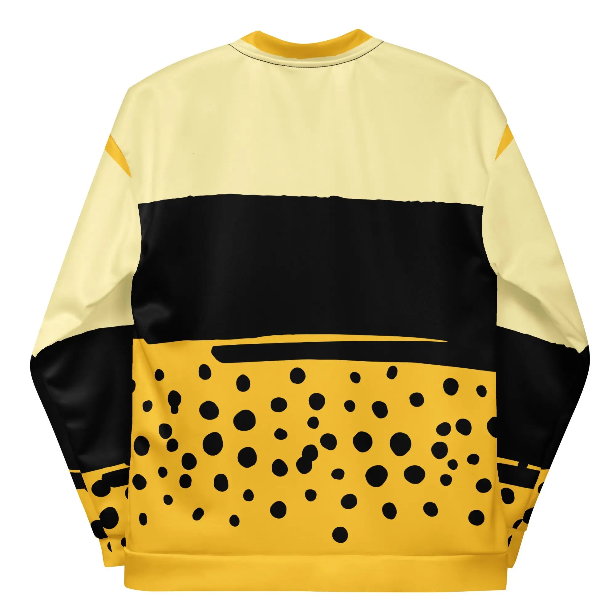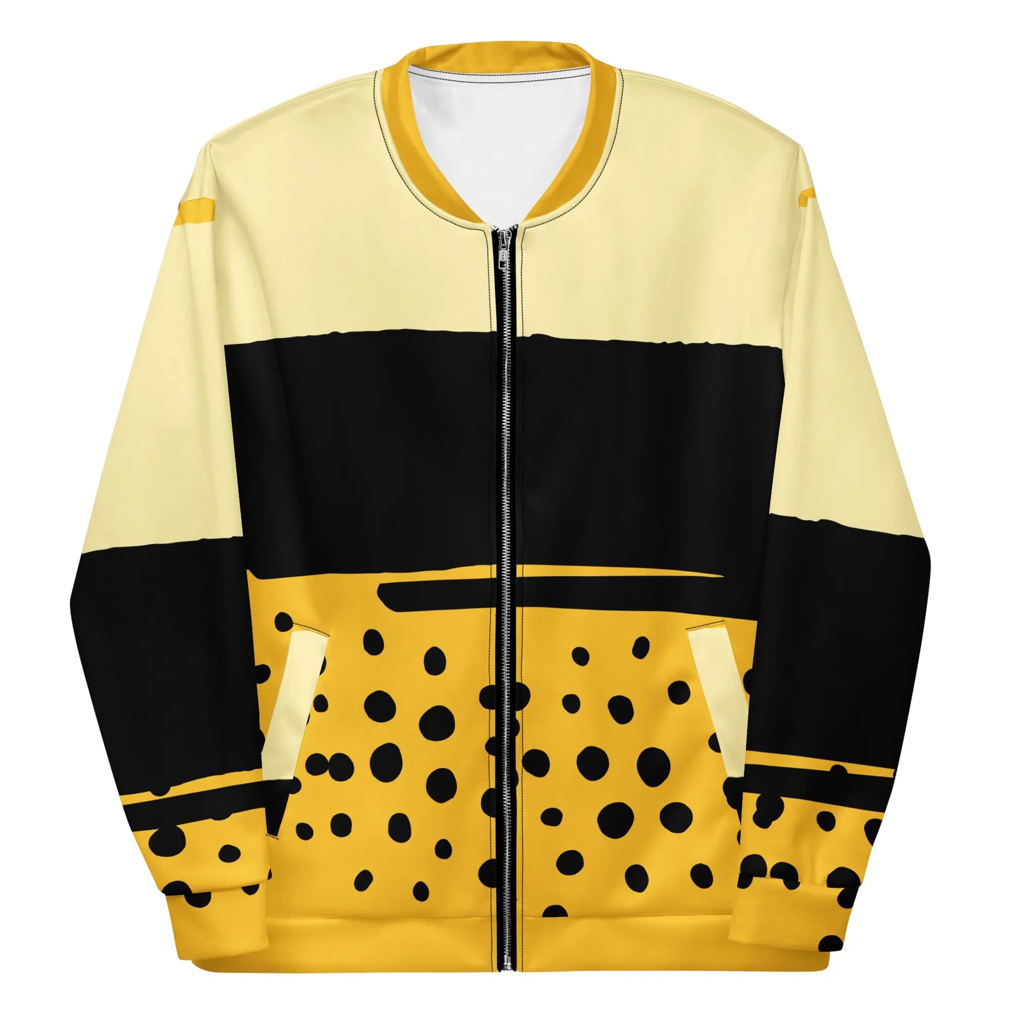 The Yellow Noise Unisex Bomber Jacket takes the chaos of summer and straps it right to your shoulders. Bursts of yellow, splashes of black, and playful polka dots collide in a design that’s loud without saying a word. It’s the kind of jacket that feels like standing in the middle of a neon storm — buzzing, alive, impossible to ignore. Whether you’re hitting the streets, crashing a rooftop party, or just outshining the skyline, this bomber keeps your look sharp and your vibe electric.